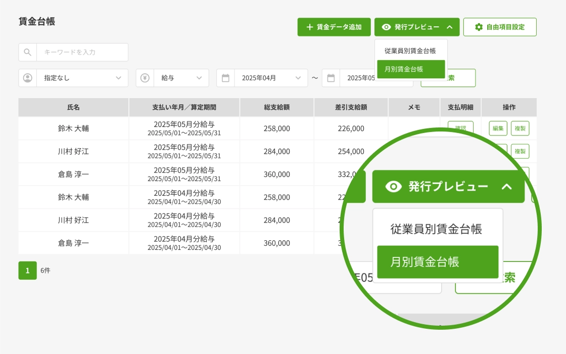従業員ごと・月ごとに自動で賃金台帳を作成。申請に必要な書類を手間なく整備できます。