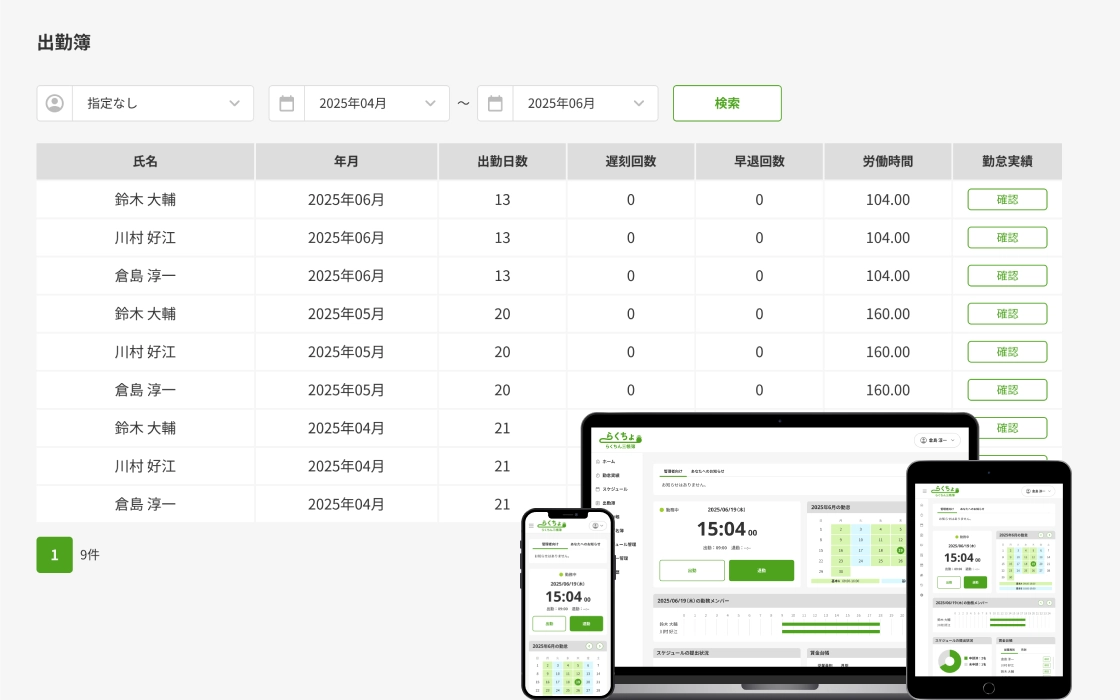 PC・スマホ・タブレットで簡単に打刻可能。出退勤を正確に記録し勤怠管理を効率化します。