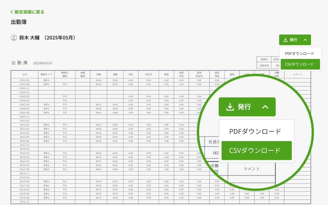 出勤簿・賃金台帳をPDFやCSVで出力可能。助成金・補助金申請や保存用の書類を素早く準備できます。